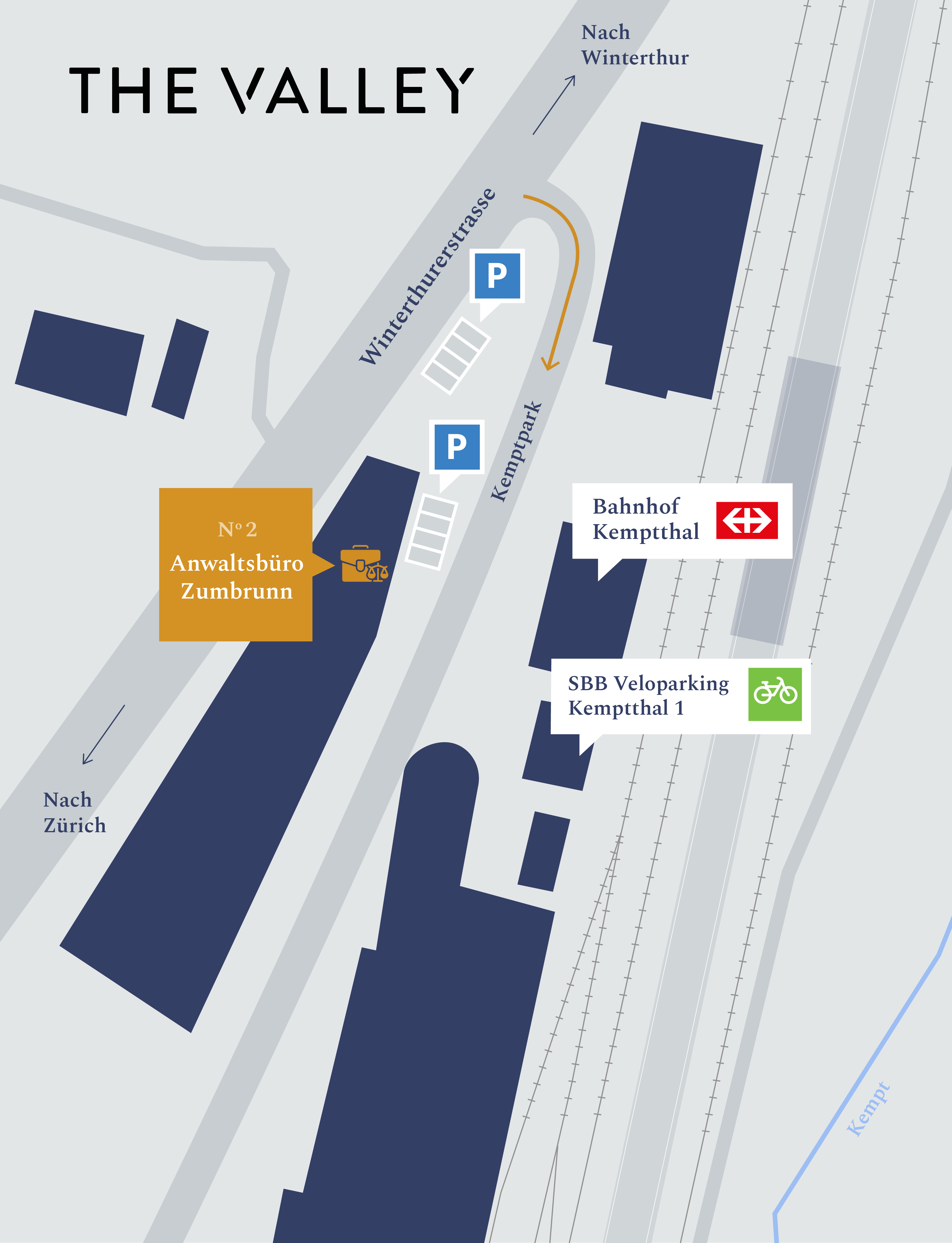 Das Anwaltsbüro liegt direkt gegenüber der Bahn- und Bushaltestelle Kemptthal auf dem ehemaligen Maggi-Areal, heute „The Valley“.